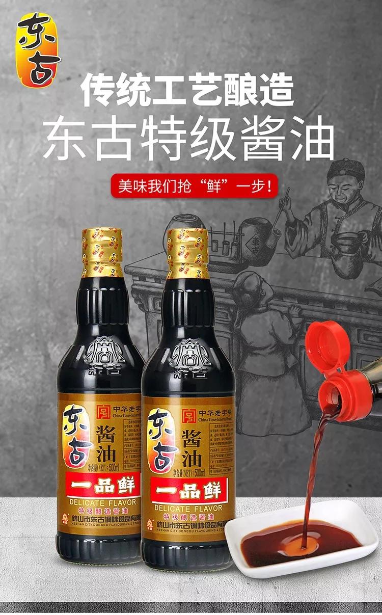 核心產(chǎn)品“東古一品鮮”,以天然山泉水為水源,采用結(jié)實(shí)飽滿非轉(zhuǎn)基因大豆、優(yōu)質(zhì)小麥粉,秉承傳統(tǒng)小池曬制工藝,深層發(fā)酵,抽取第一道原油匠心釀造而成,因而“東古一品鮮”醬香濃郁、色澤紅亮、鮮味十足,備受廣大消費(fèi)者青睞!