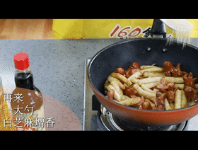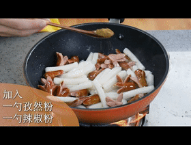 鍋中加入一勺生抽、一勺孜然粉、一勺辣椒粉、一小勺白糖、半勺鹽