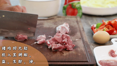 ● 豬肉切大粒,放入黑胡椒、鹽、生粉、油、東古一品鮮醬油、一只雞蛋。攪拌均勻,腌制20分鐘