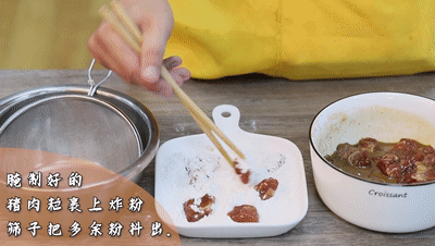 ● 腌制好的豬肉粒裹上炸粉,放到篩子中把多余的粉抖出來