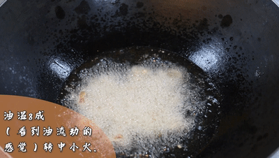● 熱鍋燒油,油溫8成(能看到油有流動的感覺)轉(zhuǎn)中小火、放入豬肉粒,炸至表面微黃撈出,再轉(zhuǎn)大火復(fù)炸,炸至黃金撈出控油