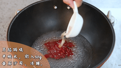● 調(diào)料汁:另起鍋燒半碗水,倒入50g番茄沙司、冰糖、半勺一品鮮醬油,小火熬至冰糖融化倒出碗中備用.