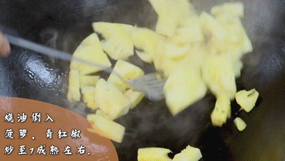 ● 熱鍋燒油、倒入菠蘿,青紅椒,炒至7成熟左右。倒入炸熟的肉粒和料汁,翻炒均勻即可