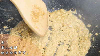 另起鍋,放入一塊黃油。再倒入碾碎的咸蛋黃碎炒出香味。