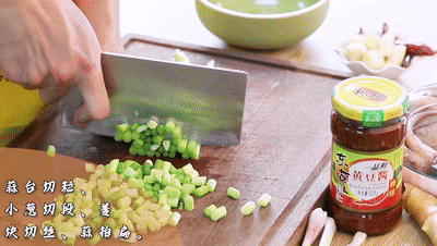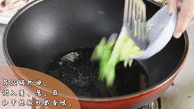 另起鍋熱油,倒入姜、蔥、蒜和干辣椒炒出香味。再倒入蒜臺(tái),炒斷生