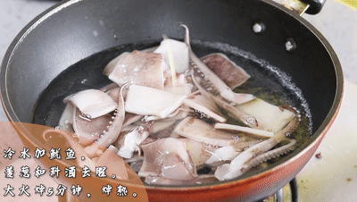 鍋里放水,冷水加入魷魚,姜蔥和料酒去腥。大火焯5分鐘,把魷魚焯熟