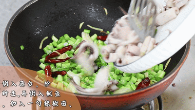 再倒入魷魚,加入一勺辣椒面、一勺一品鮮醬油、一勺東古蠔油、一勺黃豆醬,翻炒均勻即可