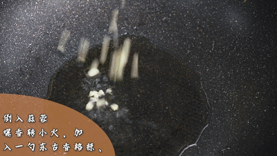 再起鍋燒油、倒入蒜蓉爆香轉(zhuǎn)小火,加入一勺東古香格辣、一勺東古生抽醬油和老抽醬油、半碗水、一勺白糖攪拌均勻