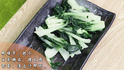 拿一個碟子,把小白菜鋪底,擺上荷包蛋,澆上汁即可