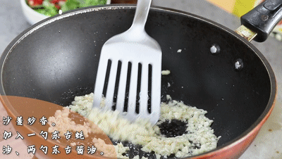 另起鍋熱油,倒入沙姜炒香。加入一勺東古蠔油、兩勺東古一品鮮醬油、一勺東古一品鮮黃豆醬、一勺白糖,再加入一湯勺高湯。
