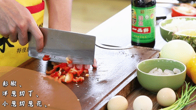 ●彩椒、洋蔥切丁,小蔥切蔥花,大蒜剁成蒜末。把菠蘿粒倒入鹽水中泡一會