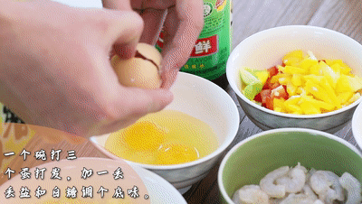 ●一個碗里打入三個雞蛋打發(fā)、加入一丟丟鹽和白糖調(diào)個底味。另一個碗再打入兩個雞蛋打發(fā),這兩個雞蛋不需要調(diào)底味