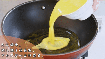 ●大火起鍋燒油,倒入調(diào)了味的雞蛋液,轉(zhuǎn)中小火炒一分鐘盛出備用