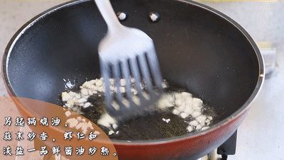 ●大火起鍋燒油,倒入蒜末爆香。再倒入蝦仁炒至變色