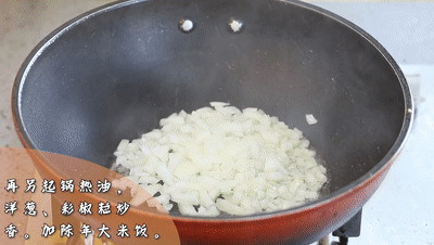 ●再另起鍋熱油,倒入洋蔥粒,彩椒粒炒香。加入陳年大米飯。