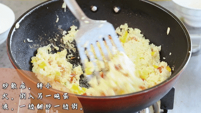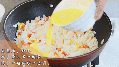 ●炒散后,轉(zhuǎn)小火,倒入另一碗雞蛋液,一邊翻炒一邊倒,讓米飯都沾上雞蛋液