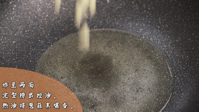 鍋里倒入厚量的油、油溫八成慢慢倒入雞蛋液,炸至兩面定型撈出控油備用