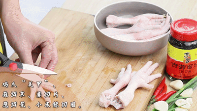 先給雞爪做個“美甲”、大蒜切成蒜末、姜塊切片、小蔥切蔥花、小米辣切圈