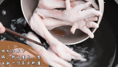 雞爪冷水下鍋,加入姜片、蔥白和一勺東古料酒,大火燒沸煮5分鐘