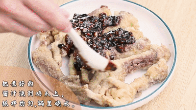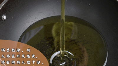 煮熟的雞爪放涼,用廚房紙擦干。鍋里熱油,倒入雞爪、炸至外皮焦黃