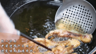 炸好的雞爪控干油,放入冷水中浸泡兩個小時,泡至雞皮呈虎皮狀