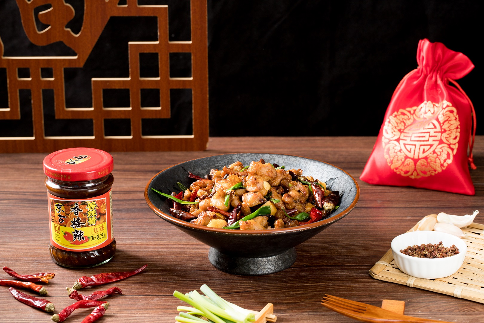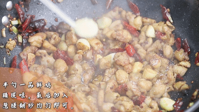 另起鍋燒油、加入大蒜蔥白爆香。加入一勺東古香格辣炒出紅油。再加入干辣椒和小米辣、倒入雞丁翻炒均勻