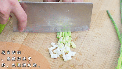 小蔥蔥白切小粒、蔥綠切中段、大蒜粒一分二切大粒、干辣椒剪成圈