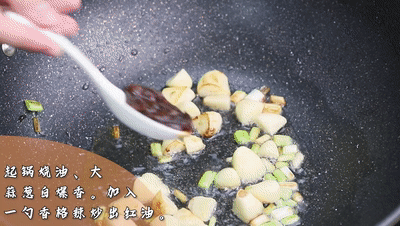加入半勺東古一品鮮雞精提味,最后加入蔥翻炒均勻即可