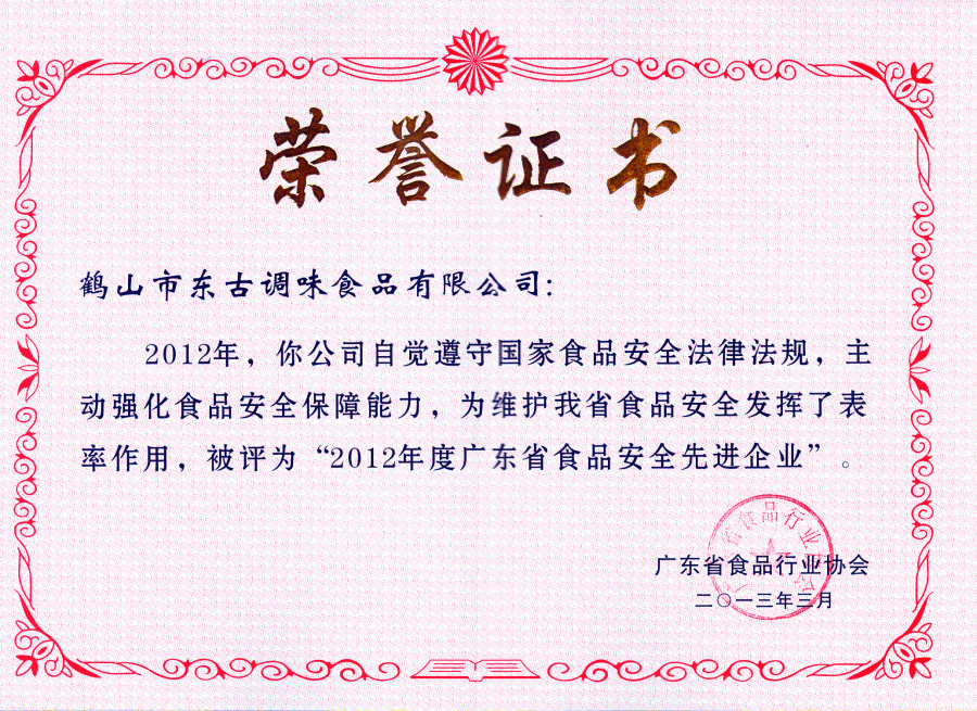 2012年度廣東省食品安全先進(jìn)企業(yè)證書(shū)