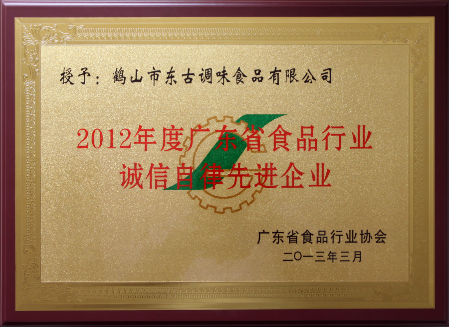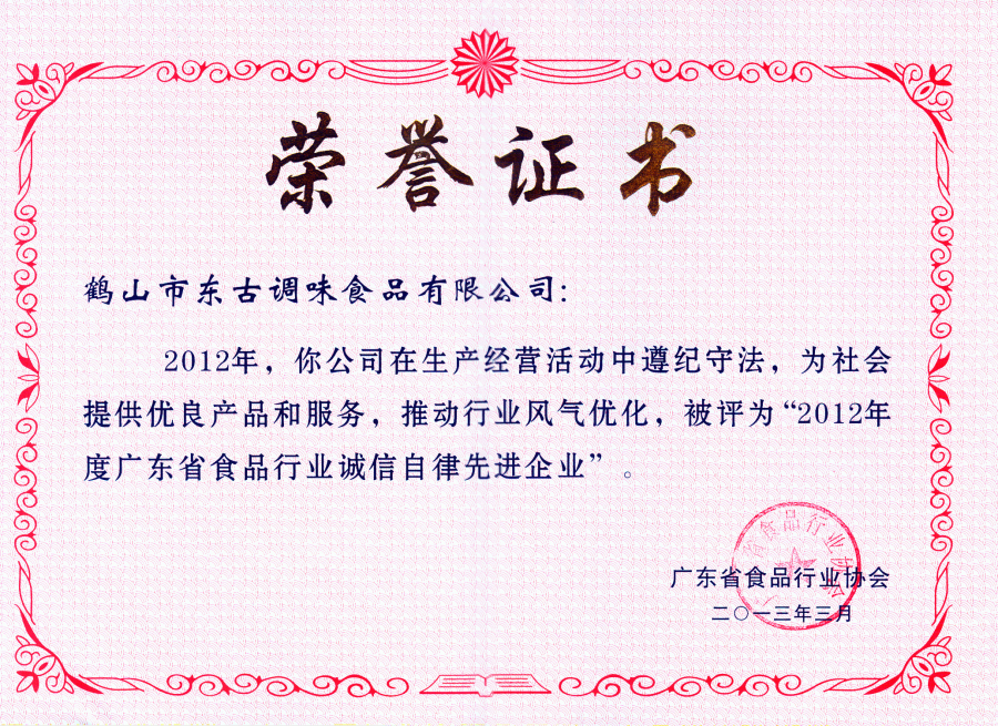 2012年度廣東省食品行業(yè)誠(chéng)信自律先進(jìn)企業(yè)證書(shū)