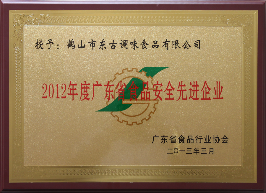 2012年廣東省食品安全先進(jìn)企業(yè)牌匾