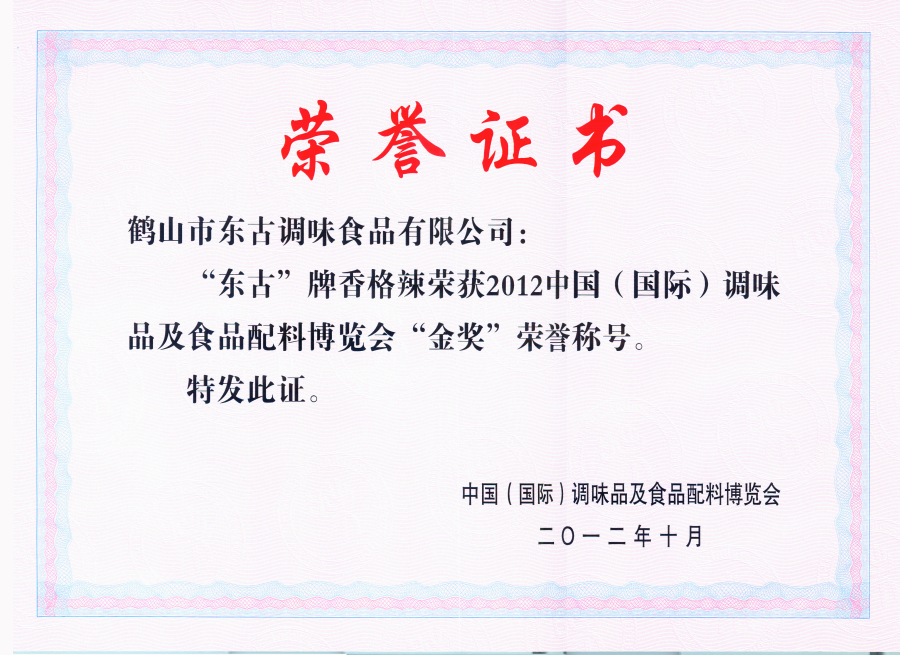 2012香格辣調(diào)味品及食品配料博覽會(huì)金獎(jiǎng)證書(shū)
